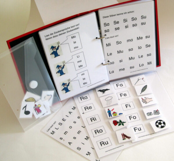 Seite 1-2: Übersichtsseiten zu den bekannten Buchstaben 1. Vokale; 2. L, M, S, R, F, N;) Seite 3-8: Buchstaben-Lesen Seite 9-20: Silben-Lese-Seiten (Vorderseite > Zeilen mit Silben; Rückseite > Zaubersprüche aus Silben) Seite 21-26: Anfangssilbe – Bild zuordnen |