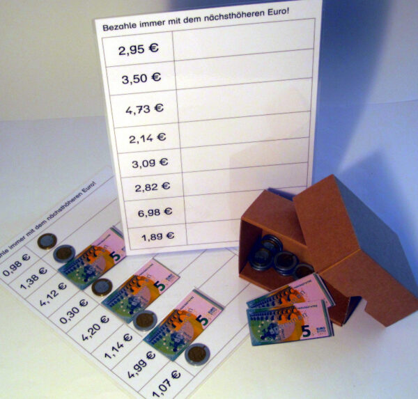 2 laminierte Vorlagen (A4); 24 Rechengeld-Münzen bzw. Scheine (+ Ersatz) in einer Pappschachtel