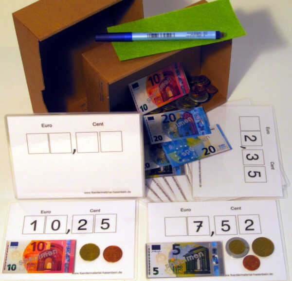16 laminierte Vorlagen (A6) mit Preisen; davon 5 x blanko mit einem trocken abwischbarer Folienstift; 62 Rechengeld-Münzen bzw. Scheine (+ Ersatz) in einer Pappschachtel