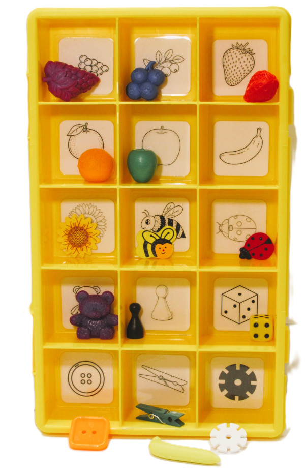 | Materialbeschreibung | Sortierkasten aus Kunststoff (ca. 29 x 18 cm) mit 15 Fächern, darin jeweils eine laminierte Zeichnung; 15 dazu passende kleine Gegenstände in einer Pappschachtel | |