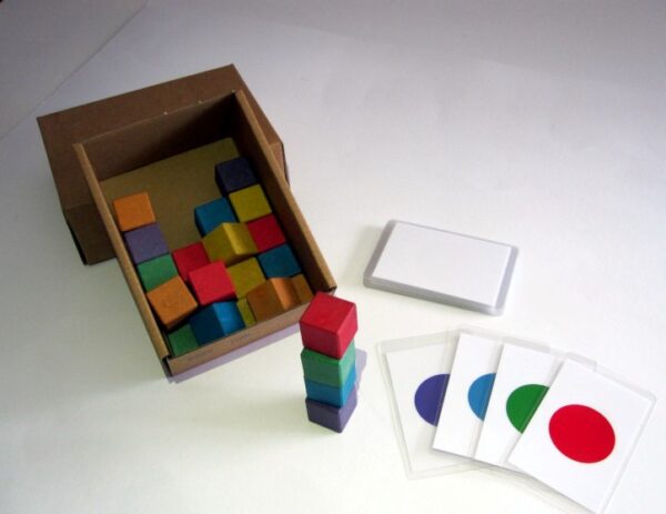 | Materialbeschreibung | 18 laminierte Farbkarten in einer Kunststoffdose; je 3 Holzlwürfel in 6 verschiedenen Farben in einer Pappschachtel; je Farbe 1 Ersatzwürfel |