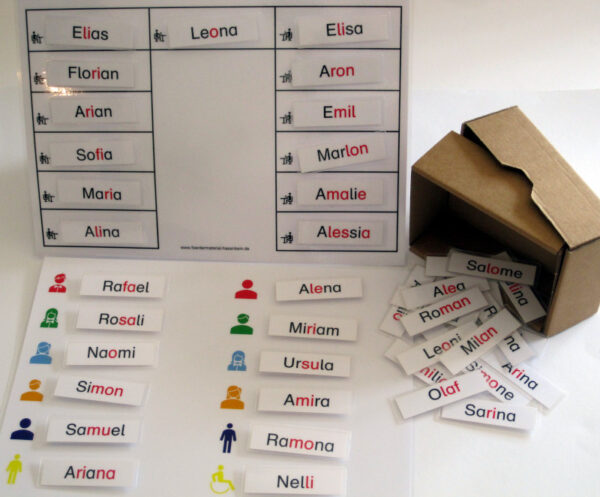 63 Namenkärtchen (zwei- bis viersilbig, ausschließlich Namen aus den Vokalen, ei, au und den Konsonanten L, M, S, R, N, F) |