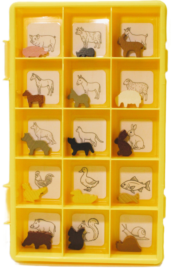 | Materialbeschreibung | Sortierkasten aus Kunststoff (ca. 29 x 18 cm) mit 15 Fächern, darin jeweils eine laminierte Zeichnung; 15 dazu passende Holztiere in einer Pappschachtel |